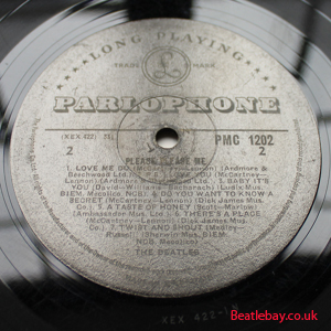 As this first run progressed, the side 2 label started slipping (down?) and became uncentred. This makes sense if the very first ever pressing had the printing error, and as the print ran, the error became less pronounced as the label slipped more and more! Interesting to note, the WOTZ tax code was never pressed on the newer (60,s) G.R.A.M.O.P.H.L.T.D coded LP machines, though it has been seen on a few runs of Love Me Do on the red label 45 pressed on a SP (Single Play) machine in 1962. |